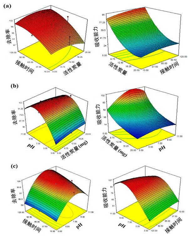 圖3:表面響應(yīng)圖吸附參數(shù)對(duì)去除和吸收能力的影響(a)活性炭劑量與接觸時(shí)間的相互作用;(b)活性炭與pH之間的相互作用;(c)相互作用pH值與接觸時(shí)間。