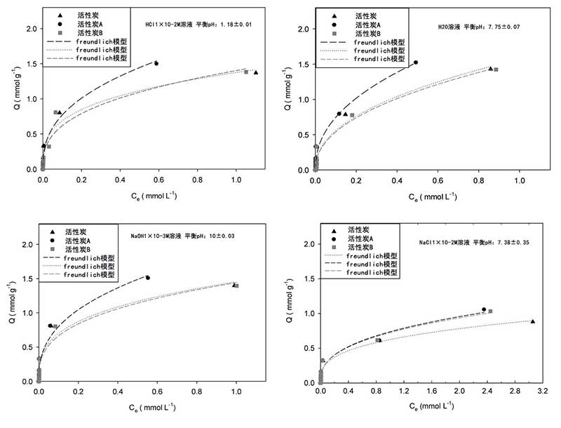 從圖3可以看出,在所有測試的實驗條件下,當平衡濃度較低(即<0.1mmol L-1)時,對羥基苯甲酸甲酯吸附量的差異三種活性炭最小,而對于較高的平衡濃度,活性炭A表現出最高的性能,活性炭和活性炭B具有相似的行為,除非離子強度發(fā)生變化。事實上,在后一種情況下,熱處理樣品顯示出最佳性能并且?guī)缀跸嗨。為了詳細分析檢索到的結果,需要進一步調查,建模分析可能會有所幫助。