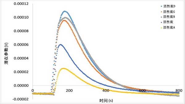 存在兩個(gè)參數(shù)之間的比例,因?yàn)榇嬖诳捎糜诜肿舆M(jìn)入的更大空間,這在吸附物和多孔結(jié)構(gòu)之間產(chǎn)生更大的相互作用。具有更高比表面積和更大相互作用的活性炭是炭D,由于吸附物和碳質(zhì)結(jié)構(gòu)之間的親和力,由于選擇性除去含氧基團(tuán)而產(chǎn)生更高的表面積并產(chǎn)生更高的浸入焓值;钚蕴緼具有最低的表面積值和較低的焓相互作用,因?yàn)楸砻嫜趸鶊F(tuán)降低了活性炭的可用空間以進(jìn)入己烷,并且由于其極性特征而產(chǎn)生與分子的較少相互作用。