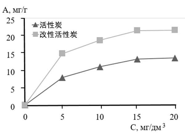 用發(fā)煙硫酸處理活性炭導(dǎo)致磺酸鹽基團(tuán)捕獲吸附劑表面和孔內(nèi)部。用二氯乙烷對(duì)活性炭的初級(jí)處理有利于磺化劑在孔深度中的滲透,從而增強(qiáng)氧化,并由此促進(jìn)磺酸鹽基團(tuán)的形成?咨疃戎谢撬猁}基團(tuán)的存在增加了吸附劑相對(duì)于汞離子的吸附能力。對(duì)于改性活性炭在靜態(tài)條件下對(duì)汞離子吸附的研究結(jié)果,根據(jù)獲得的實(shí)驗(yàn)數(shù)據(jù),繪制了活性炭和改性活性炭的比較等溫線(圖1)。