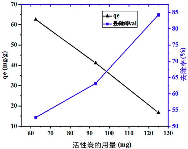 圖3:pH對活性炭的吸附容量和鉛去除百分比影響。
