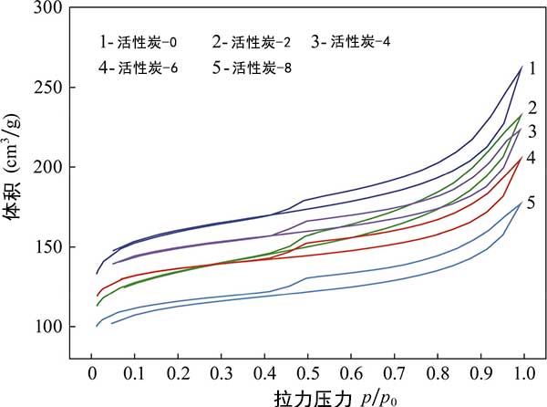 氮等溫線:圖2顯示了活性炭的氮吸附-解吸等溫線?梢钥闯觯鶕(jù)IUPAC分類,所有活性炭的等溫線屬于具有磁滯回線的Ⅳ型等溫線,表明活性炭具有中孔。隨著四氧化三鐵添加量的增加,活性炭的等溫線低于載鐵活性炭的等溫線,表明比表面積減小,孔隙增大。