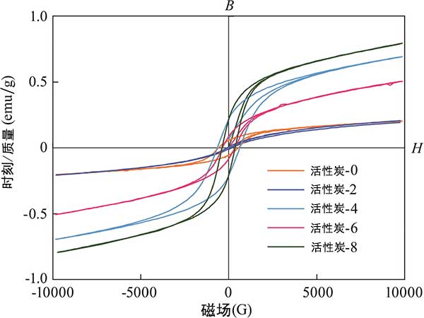 活性炭的磁滯回線如圖3所示。隨著鐵含量增加,活性炭的飽和磁化強度首先降低并隨后增加;钚蕴康娘柡痛呕瘡姸戎蹬c活性炭中殘留的四氧化三鐵和金屬鐵的量有關(guān),因為它們具有磁效應(yīng)。活性炭的特定磁化率是磁分離的重要參數(shù)之一。