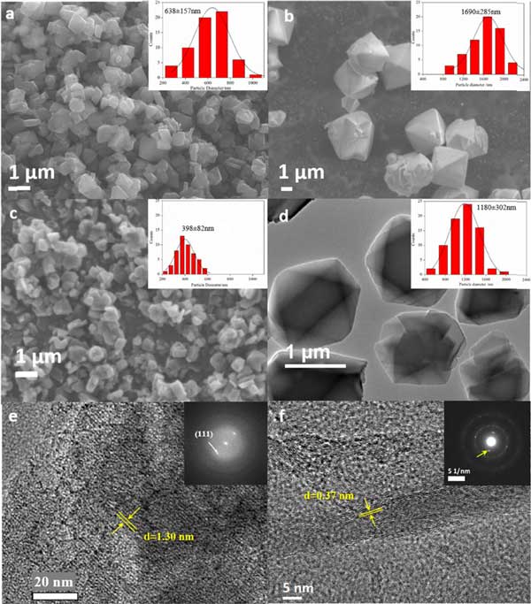 圖2:幾種材料的掃描電子顯微鏡圖像和粒度分布,透射電子顯微鏡圖像和粒度分布,高分辨率TEM圖像。
