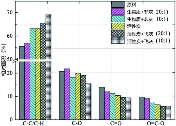 表面基團的芳香族C-C或C-H隨著活性炭原料在熱解時的比例增加以及氣體活化而增加可以從圖2中可以看出。這是預(yù)期的,在不完全燃燒和部分氧化可導(dǎo)致在含碳材料內(nèi)形成芳族化合物。含氧官能團如C-O,C=O和O.=隨著生物炭和活性炭的煤飛灰比例增加,C-O的相對面積減小。煤飛灰似乎提高了芳構(gòu)化程度,但顯著降低了羰基的相對濃度,同時保持或適度降低了酮和羧酸的性質(zhì)。這可能涉及先前發(fā)現(xiàn)的用于生物質(zhì)和煤飛灰的共熱解的生物燃料的增強的脫氧,并且表明活性炭的表面化學(xué)可以使用煤飛灰作為添加劑來介導(dǎo)。