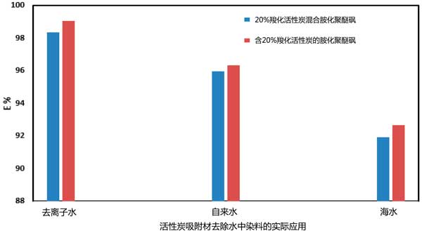 圖3:胺化聚醚砜和20%羧化活性炭對不同實(shí)際樣品中酸性紅的吸附百分比。