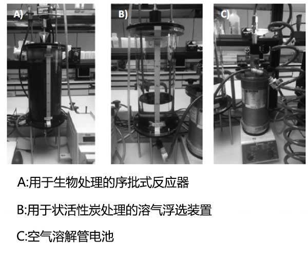 污水處理廠的活性污泥用于承載微生物,收集活性污泥并對其主要參數(shù)進(jìn)行表征銨,硝酸鹽,亞硝酸鹽,磷酸鹽,化學(xué)需氧量,生物需氧量,總懸浮固體和pH每周一次,并儲存在4°C直至使用。將5L活性污泥泵入生物處理的序批式反應(yīng)器,混合并充氣2小時,然后使污泥靜置30分鐘。將1.7L上清液轉(zhuǎn)移至活性炭處理的溶氣浮選裝置單元,其中加入粉末狀活性炭并混合(30分鐘)。下一步包括加入凝結(jié)劑聚氯化鋁,12分鐘后加入絮凝劑。最后,將飽和水注入活性炭處理的溶氣浮選裝置裝置,開始分離步驟(12分鐘)。整個過程持續(xù)了大約四個小時。