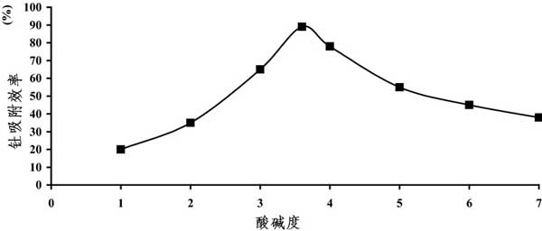 圖2:用三苯基氧化膦改性活性炭對(duì)酸堿度對(duì)釷吸附效率的影響。