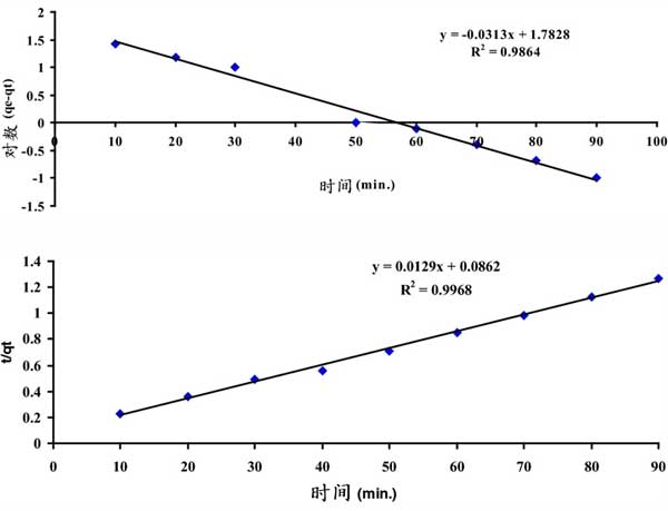 圖5:用三苯基氧化膦改性活性炭的釷離子偽一級(jí)和偽二級(jí)吸附模型。