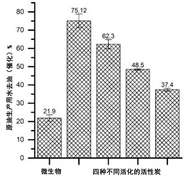 簡(jiǎn)而言之,使用活性炭(60%-93%)和載微生物活性炭(16%-84%)比游離的無活性炭載體的微生物(1%-47%)更好地去除芳香烴。材料的孔隙率和吸附偶極性有利于吸附。常規(guī)活性炭表現(xiàn)出高度的微孔性,其中可以容納分子量約為100的苯,甲苯和苯酚;钚蕴康姆菢O性特征保證了碳?xì)浠衔锏氖杷,也是非極性的;钚蕴筷栯x子表面有利于芳烴保留,因?yàn)榉辑h(huán)中的π電子與表面陽離子靜電連接。使用常規(guī)活性炭和載微生物活性炭的原油去除能力如圖3所示。使用游離的微生物和油-鹽水乳液作為對(duì)照。