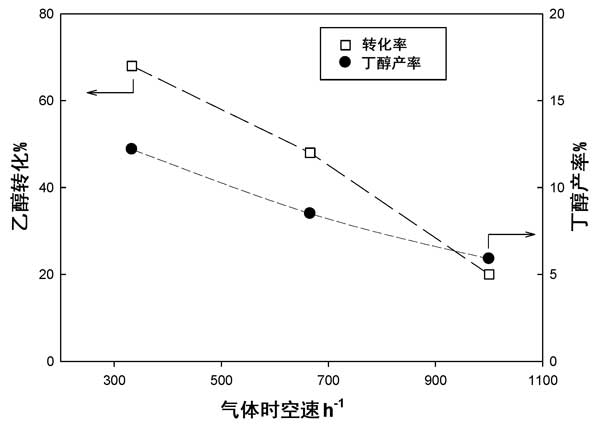 通過改變反應(yīng)器中的活性炭負(fù)載量,同時(shí)保持總流速和入口乙醇濃度不變,在400°C下初步研究了氣體時(shí)空速度對20%活性炭負(fù)載氧化鎂樣品的影響。結(jié)果以乙醇轉(zhuǎn)化率和丁醇產(chǎn)率報(bào)告于圖3。正如預(yù)期的那樣,乙醇轉(zhuǎn)化率通過降低氣體時(shí)空速度而增加。值得注意的是,對于較低的氣體時(shí)空速度值,制得丁醇的產(chǎn)率也增加。應(yīng)該注意的是,在我們的實(shí)驗(yàn)中負(fù)載的最大催化劑量(1克)對應(yīng)于約3厘米的催化床高度。更長的催化劑床層將超過電爐的等溫區(qū),因此,未探索出較低的氣體時(shí)空速度值。另一方面,即使使用較大可能劑量的催化劑,在350°C下進(jìn)行測試所得到的丁醇產(chǎn)量也可忽略不計(jì)。