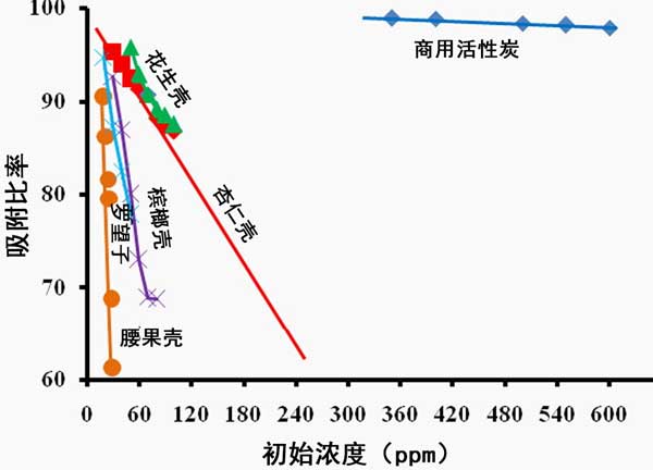 圖1:天青A初始濃度對(duì)各種活性炭的影響。