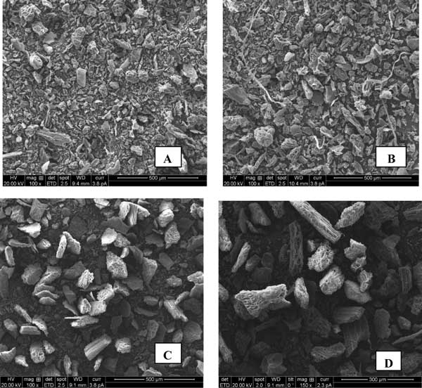 圖4:活性炭在吸附之前(A,C)和吸附之后(B,D)的SEM圖像。