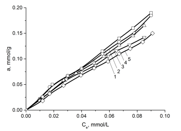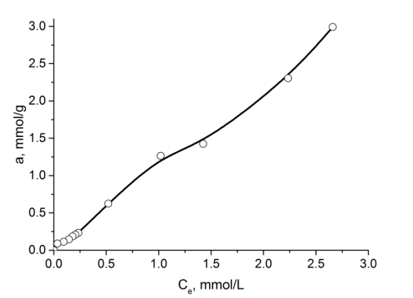 鍶離子的吸附平衡常數(shù)得出吸附平衡常數(shù)等于2,并且ΔG0值分別為0.5 kJ / mol。根據(jù)以前的數(shù)據(jù),活性炭吸附劑-H2O的水界面ΔG0等于2.3 kJ / mol。具有比溶劑(水)低的標(biāo)準(zhǔn)摩爾吸附微分自由能(ΔG0)的吸附劑無(wú)法將其從吸附劑表面(從其孔隙)中置換出來(lái),但是鍶離子在相對(duì)較高的平衡濃度下被吸附,其值這些離子的吸附量相當(dāng)大(圖1)。這種現(xiàn)象可以通過(guò)以下事實(shí)來(lái)解釋:在低平衡濃度下,鍶離子與活性炭的多孔結(jié)構(gòu)中的水分子相互作用,從而形成Sr(OH)+離子。活性炭微孔結(jié)構(gòu)中Sr(OH)+的形成和擴(kuò)散過(guò)程已有實(shí)驗(yàn)。在相對(duì)較高的平衡濃度下,水分子不會(huì)因與羧基(-COOH)以及與磷酸鹽和多磷酸鹽基團(tuán)(P = O,COP)相互作用而與活性炭結(jié)合的鍶離子置換。