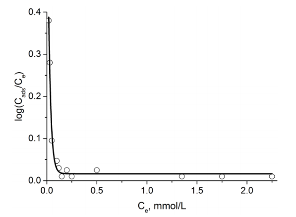 圖1顯示了活性炭上鍶離子從水溶液中的吸附等溫線。如圖1所示,即使在較高的平衡濃度下,所顯示的等溫線也具有拐點(diǎn)。坐標(biāo)中鍶離子的吸附等溫線如圖2所示。通過(guò)外推曲線,以圖形方式獲得logKads值。活性炭的結(jié)構(gòu)參數(shù)由Dubinin–Radushkevich方程根據(jù)苯吸附-解吸等溫線確定。