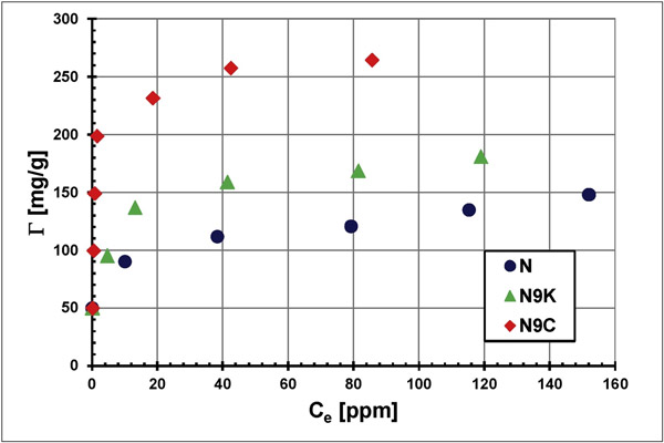 在圖3中比較了初始濃度為100 ppm的活性炭,N9K和N9C表面上初始濃度為100 ppm的聚合物溶液中PAA(Γ)的吸附量。?梢钥闯,對(duì)于所有檢查的活性炭,觀察到隨著pH升高聚合物吸附明顯減少。這是由于所檢查系統(tǒng)中的靜電條件從有利的吸引條件(在較低的pH值)變?yōu)椴焕呐懦鈼l件(在較高的pH值)而引起的。而且,在更酸性的環(huán)境中,聚合物鏈的盤繞構(gòu)型使得吸附層的堆積更為緊密(高PAA吸附)。在較高的pH值下,PAA鏈發(fā)展的增加導(dǎo)致表面層中吸附的大分子的構(gòu)型更加延長(zhǎng),其特征是聚合物鏈段的堆積密度顯著降低(PAA吸附低)。
