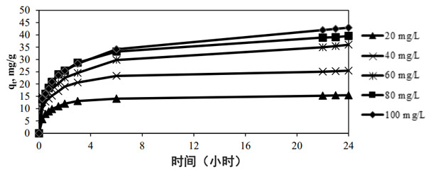 圖2說明了甲基黃初始濃度和接觸時間對30°C時吸附平衡的影響。隨著初始染料濃度從20 mg/L增加到100 mg/L,發(fā)現(xiàn)平衡時的染料吸附量增加。這些表明初始濃度提供了必要的驅(qū)動力,以克服對染料分子在水相和固相之間傳質(zhì)的阻力。初始濃度越高,濃度梯度的驅(qū)動力越大。從圖中可以看出,較高的初始濃度的染料溶液需要更長的接觸時間才能達(dá)到平衡。初始濃度為20-40 mg/L的染料溶液達(dá)到平衡所需的接觸時間約為3-5小時。