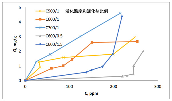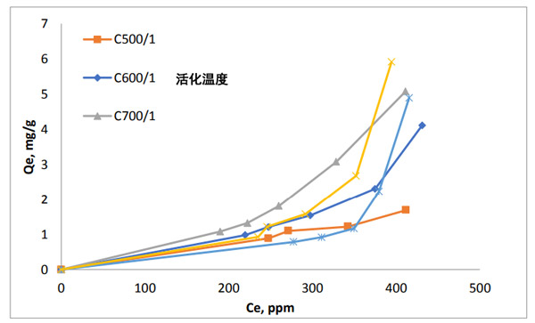 圖3顯示了鈣離子的吸附等溫線。等溫線表示分類的I型或II型。較低溶液濃度下的小肩部可能暗示了鈣離子微孔填充的單層吸附飽和。這表明孔表面與鈣離子之間的相互作用較強(qiáng);钚蕴康牡涂紫抖热员硎綢II型等溫線,因?yàn)闆]有明顯的微孔可以被鈣離子填充,而不是外表面和大孔。