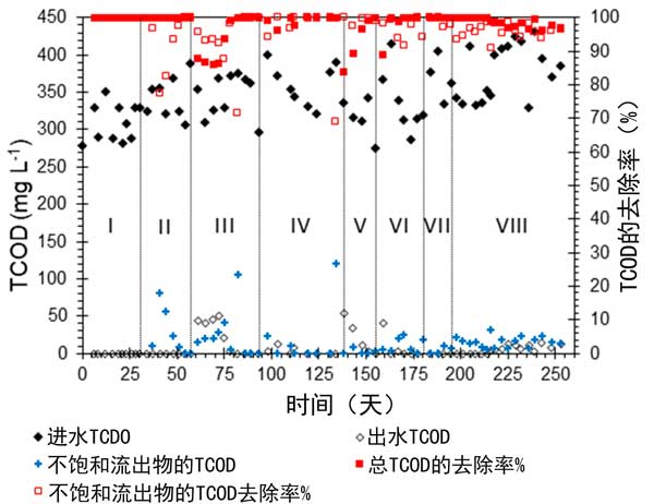 圖2:進水中不飽和廢水和總廢水中總化學需氧量的濃度以及兩種廢水中的去除百分率隨活性炭運行時間的變化(d)。