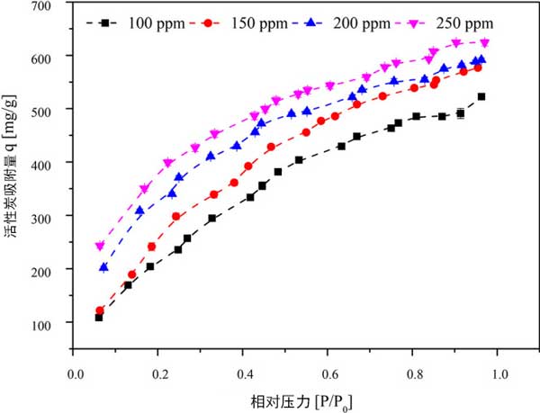 為了確定三氯乙烯初始濃度在進(jìn)料流中的影響,研究了100、150、200和250ppm的濃度。維持其他實(shí)驗(yàn)條件,活性炭顆粒大小為355μm,床溫為30°C,活性炭重量為50mg。入口濃度為100、150、200和250ppm時的吸附容量分別為523.252、575.844、593.181和624.044mg/g。隨著入口三氯乙烯濃度的增加,在壓力增加的情況下,活性炭的吸附容量顯示出穩(wěn)定的增加。在較高濃度下,隨著壓力的增加,吸附容量的增加可能是由于相鄰分子與微孔中的層內(nèi)分子粘附所致。這導(dǎo)致形成粘附在吸附劑表面上的層內(nèi)分子的相鄰三氯乙烯分子堆疊。三氯乙烯分子的平面形狀的動力學(xué)直徑為6.6。因此,它會積聚在活性炭的微孔/中孔上。在活性炭的微孔區(qū)域中具有大孔體積的情況下,假設(shè)縫隙形狀的孔幾何形狀,則期望對活性炭上的三氯乙烯具有高親和力。在低濃度(0-8000μg/L)的活性炭上進(jìn)行了三氯乙烯的吸附,在室溫下吸附量為160mg/g。