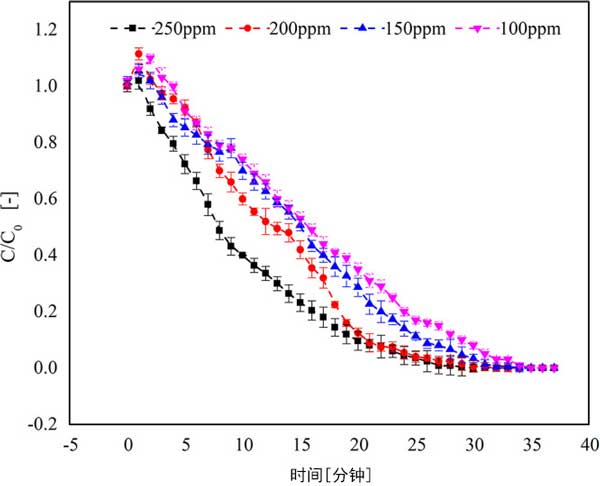 圖2:改變進(jìn)氣中三氯乙烯的初始濃度對活性炭吸附能力的影響。