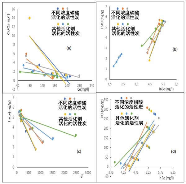 圖3:根據Langmuir(a),F(xiàn)reundlich,(b)條件D-R-K,(c)和Temkin,(D)苯二胺在活性炭上的吸附等溫線。