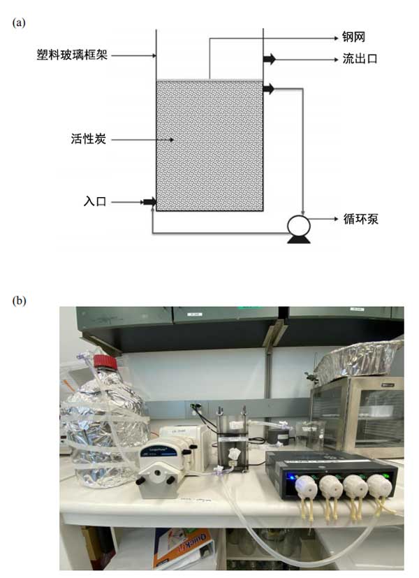 圖1:(a)活性炭的示意圖生物濾池,(b)活性炭生物濾池設(shè)置的照片。