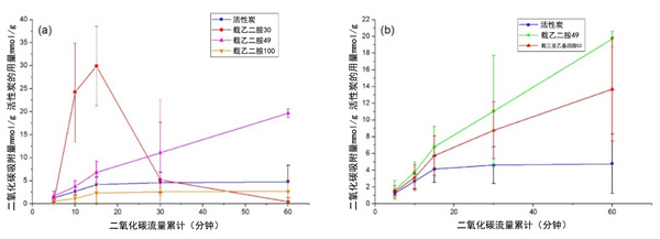 圖1:活性炭和(a)活性炭載乙二胺對二氧化碳的吸附能力,(b)活性炭載乙二胺和三亞乙基四胺的對比。