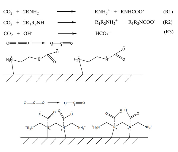 圖2:胺官能化活性炭表面上的乙二胺和三亞乙基四胺與二氧化碳之間的擬議反應(yīng)機理。