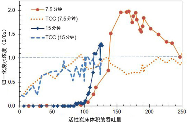 空床接觸時間對突破的影響說明如下:圖2用于123-三氯丙烷。盡管7.5分鐘和15分鐘EBCT的123-三氯丙烷突破的開始是相似的,但在100,000床體積之后,與7.5分鐘EBCT相比,15分鐘EBCT的突破更早。更長的EBCT容量降低可能是活性炭結(jié)垢的結(jié)果,這是由于更強的吸附力和不可置換的DOM到達吸附床的更深處,并超過了目標有機物的吸附位點和/或覆蓋了活性炭顆粒的孔而導(dǎo)致的。時間并防止進一步的目標有機物吸附。通過比較相似突破點的吞吐能力差異,說明了EBCT對其他cVOC的活性炭性能的影響,其中負值表示在15分鐘EBCT時容量更大,正值表示在7.5分鐘EBCT時容量更大(或在15分鐘EBCT時容量較小)。床體積數(shù)量達到突破的10%,50%或75%的平均容量差異(不包括VC,因為未評估15分鐘EBCT)分別為-0.1%,9%和13%,表明在運行時容量沒有損失。15分鐘的EBCT突破了10%,突破了適度的容量,因為更長的EBCT結(jié)垢了,因此突破了50%和75%。