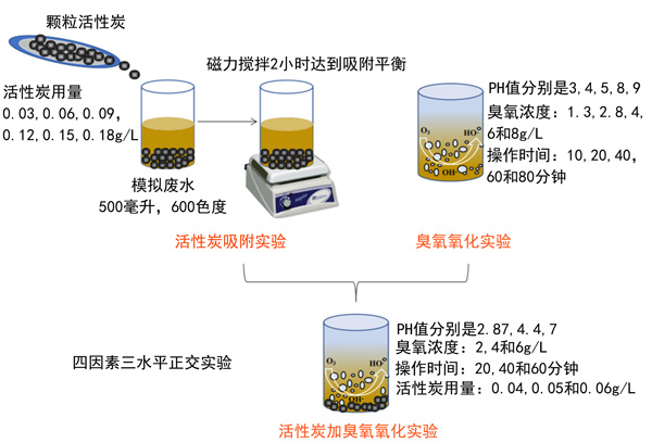 根據(jù)以前的單個(gè)活性炭吸附和臭氧化實(shí)驗(yàn)的結(jié)果,設(shè)計(jì)了四個(gè)因素和三個(gè)水平的正交實(shí)驗(yàn),討論模擬廢水的色度和COD cr去除效果并確定最佳實(shí)驗(yàn)參數(shù)。具有操作條件的實(shí)驗(yàn)程序設(shè)計(jì)流程圖如圖2所示。