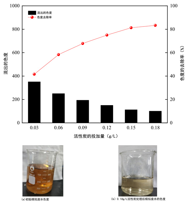 圖3:活性炭用量對(duì)模擬廢水中色度去除的影響,模擬廢水的色度。