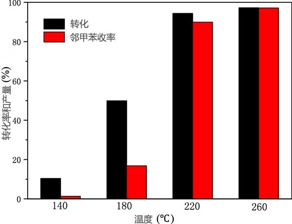 為了評價制備的磷化鎳活性炭的有用性,進(jìn)行對生物油模型化合物加氫脫氧的活性。在測試中,我們使用SA(水楊醛)作為熱解油的代表性組分來探索加氫脫氧途徑。在這項工作中,SA轉(zhuǎn)化為鄰甲酚可以通過路徑氫化/氫解或C=O鍵的直接氫解進(jìn)行。圖2顯示了加氫脫氧相對于鎳的轉(zhuǎn)化率和產(chǎn)率活性炭受反應(yīng)溫度影響。結(jié)果表明,隨著反應(yīng)溫度的升高,SA的轉(zhuǎn)化率和鄰甲酚的收率逐漸增加。當(dāng)反應(yīng)溫度為260℃時,鄰甲酚目標(biāo)產(chǎn)物的產(chǎn)率較大,2小時達(dá)到97.1%,這表明反應(yīng)溫度顯著提高了它的區(qū)域選擇性加氫脫氧的催化活性。
